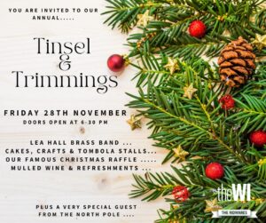 It’s our annual ‘Tinsel & Trimmings’ event on Friday 28th November, where a warm welcome & lots of seasonal cheer awaits you.